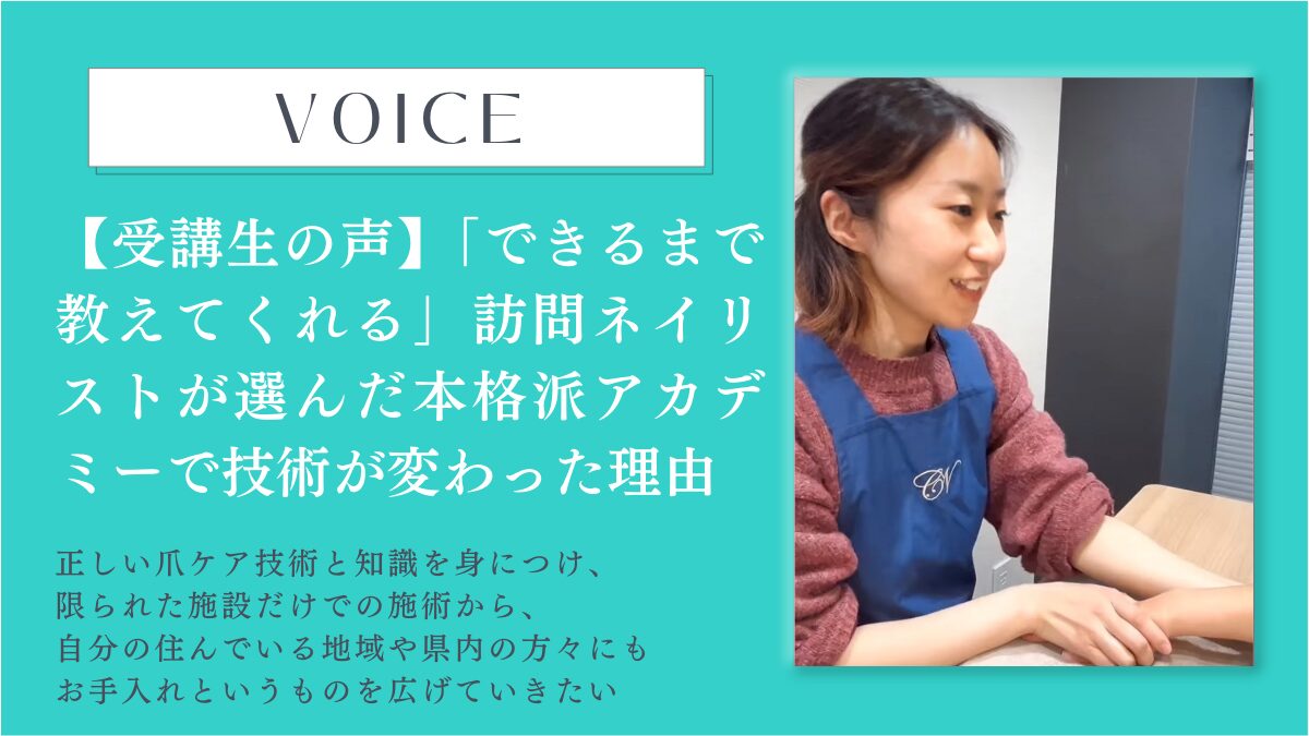 私は、もともと色を塗るマニキュアを中心にさせていただいていたのですが、爪が乾燥した状態で、マニキュアを塗るということを続けていく中で、「これはプロとしてどうなのか?」という疑問を持ち始めてから先生のアカデミーに出会って受講しようということに至りました。